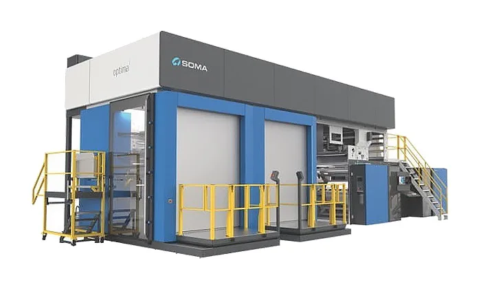 Our production floor is equipped with high-speed flexographic presses SOMA 850-1270-10EG/WG M capable of printing up to 10 colors. With a working width of up to 1000 mm and an adjustable repeat length from 360 to 1000 mm, these machines provide exceptional flexibility for various packaging formats. The presse support additional applications such as coatings and varnishes in a separate pass on finished laminates. Unit features advanced video monitoring, automated ink supply and viscosity control, and high-efficiency drying systems that enable stable, high-speed printing.
